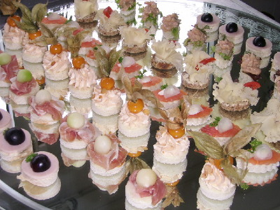 Geflügelmedaillon, garnierte Schweinefilets mit Früchten, Parmaschinken mit Cavaillonmelone, oder frische Lachsmedaillons an Dill - Senf Tunke, mit Gänsestopfleberpralinen oder Pastete, mit freigebackener Rehfiletpastete im Teigmantel, einer Entenbrustgalantine mit kalter Früchte - currysauce, hausmarinierte Auberginen und Zucchini, hausgebeizter Graved Lax an Gravedtunke, hausgemachte Wildschweinterrine, marinierte Artischocken mit Meeresfrüchten, oder für Galaempfänge klassische Canapees mit verschiedenen Auflagen.